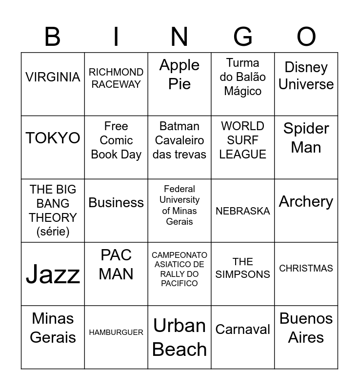 This bingo card has a free space and 24 words: PAC MAN, HAMBURGUER, Batman Cavaleiro das trevas, Minas Gerais, Disney Universe, VIRGINIA, TOKYO, RICHMOND RACEWAY, NEBRASKA, CAMPEONATO ASIATICO DE RALLY DO PACIFICO, WORLD SURF LEAGUE, THE BIG BANG THEORY (série), THE SIMPSONS, CHRISTMAS, Free Comic Book Day, Carnaval, Archery, Apple Pie, Spider Man, Business, Buenos Aires, Jazz, Turma do Balão Mágico and Urban Beach.