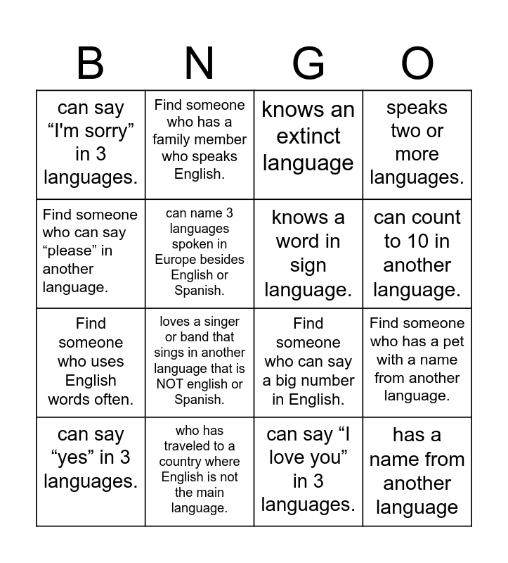This bingo card has 16 words: can say “yes” in 3 languages., who has traveled to a country where English is not the main language., knows an extinct language, speaks two or more languages., Find someone who can say “please” in another language., Find someone who has a family member who speaks English., Find someone who can say a big number in English., Find someone who has a pet with a name from another language., can say “I'm sorry” in 3 languages., can name 3 languages spoken in Europe besides English or Spanish., can say “I love you” in 3 languages., can count to 10 in another language., Find someone who uses English words often., loves a singer or band that sings in another language that is NOT english or Spanish., knows a word in sign language. and has a name from another language.