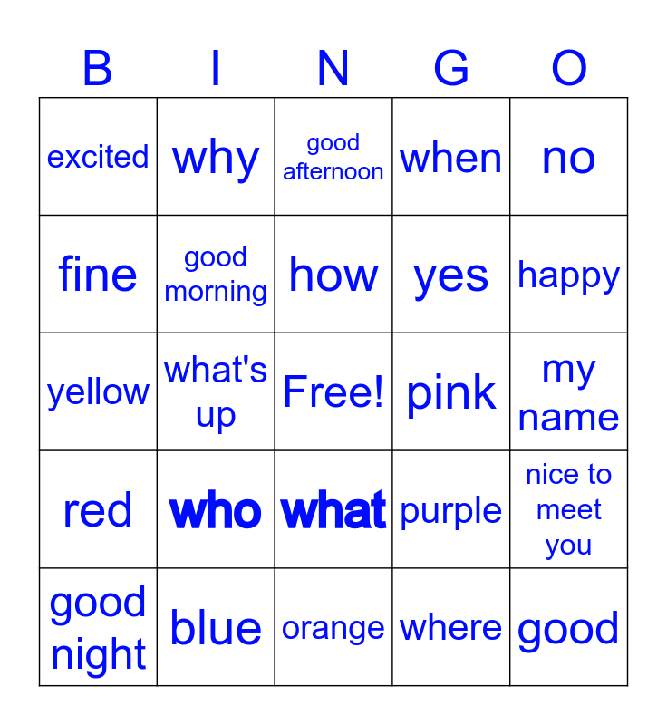 This bingo card has a free space and 24 words: who, blue, how, good night, no, excited, fine, why, pink, what, yes, yellow, purple, nice to meet you, good morning, where, my name, good afternoon, happy, what's up, good, red, when and orange.