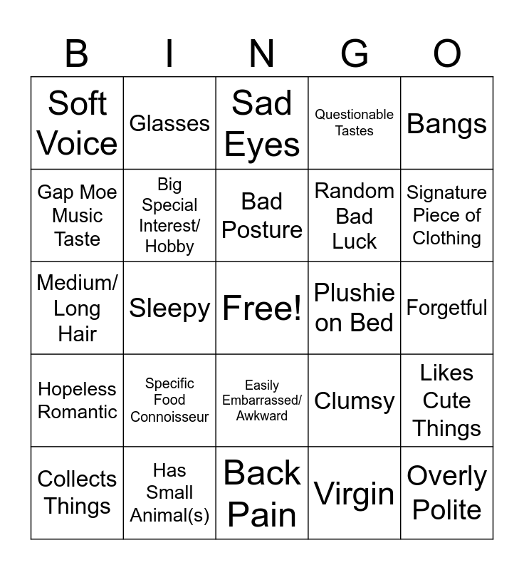 This bingo card has a free space and 24 words: Specific Food Connoisseur, Has Small Animal(s), Bad Posture, Collects Things, Bangs, Soft Voice, Gap Moe Music Taste, Glasses, Plushie on Bed, Easily Embarrassed/ Awkward, Random Bad Luck, Medium/ Long Hair, Clumsy, Likes Cute Things, Big Special Interest/ Hobby, Virgin, Forgetful, Sad Eyes, Signature Piece of Clothing, Sleepy, Overly Polite, Hopeless Romantic, Questionable Tastes and Back Pain.