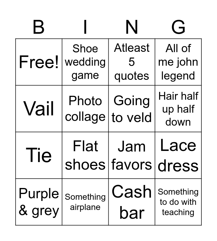 This bingo card has 16 words: Purple & grey, Something airplane, Atleast 5 quotes, All of me john legend, Vail, Shoe wedding game, Jam favors, Lace dress, Free!, Photo collage, Cash bar, Hair half up half down, Tie, Flat shoes, Going to veld and Something to do with teaching.