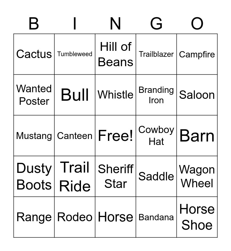 This bingo card has a free space and 30 words: Rodeo, Reckon, Canteen, Gold Nugget, Cactus, Hill of Beans, Bull, Sheriff Star, Cowboy Hat, Horse, Barn, Horse Shoe, Bandana, Fence, Saloon, Cow, Saddle, Dusty Boots, Trail Ride, Campfire, Mustang, Deputy, Tumbleweed, Branding Iron, Wanted Poster, Trailblazer, Wagon Wheel, Range, Whistle and Fringes.