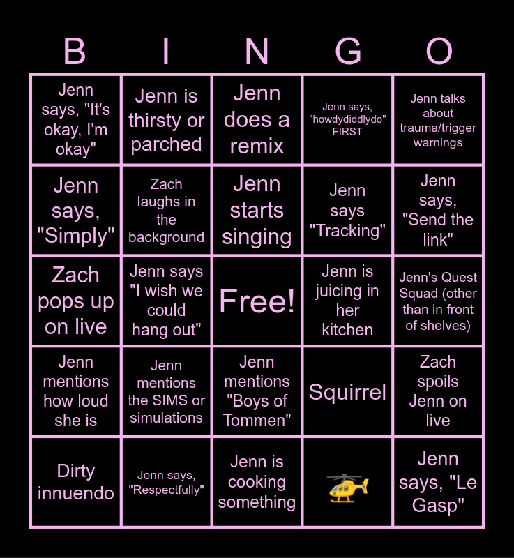 This bingo card has a free space and 26 words: Jenn mentions "Boys of Tommen", 🚁, Jenn starts singing, Jenn says, "Respectfully", Jenn talks about trauma/trigger warnings, Jenn says, "It's okay, I'm okay", Jenn says, "Simply", Jenn is thirsty or parched, Jenn's Quest Squad (other than in front of shelves), Squirrel, Jenn says "Tracking", Zach pops up on live, Zach spoils Jenn on live, Dirty innuendo, Jenn says "I wish we could hang out", Jenn rearranges shelf and mentions it, Jenn says, "howdydiddlydo" FIRST, Jenn mentions how loud she is, Jenn does a remix, Jenn says, "Le Gasp", Jenn says, "Send the link", Jenn is cooking something, Jenn is juicing in her kitchen, Jenn mentions the SIMS or simulations, Zach laughs in the background and Zach kicks Jenn off live.