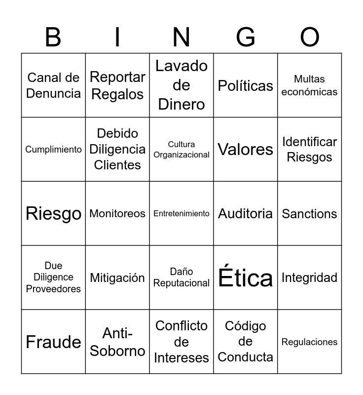 This bingo card has a free space and 27 words: Ética, Informar Irregularidades, Valores, Conflicto de Intereses, Cumplimiento, Lavado de Dinero, Reportar Regalos, Due Diligence Proveedores, Auditoria, Integridad, Riesgo, Políticas, Fraude, Anti-Soborno, Identificar Riesgos, Anti-corrupción, Debido Diligencia Clientes, Cultura Organizacional, Mitigación, Canal de Denuncia, Sanctions, Código de Conducta, Monitoreos, Regulaciones, Daño Reputacional, Multas económicas and Sanciones disciplinarias.