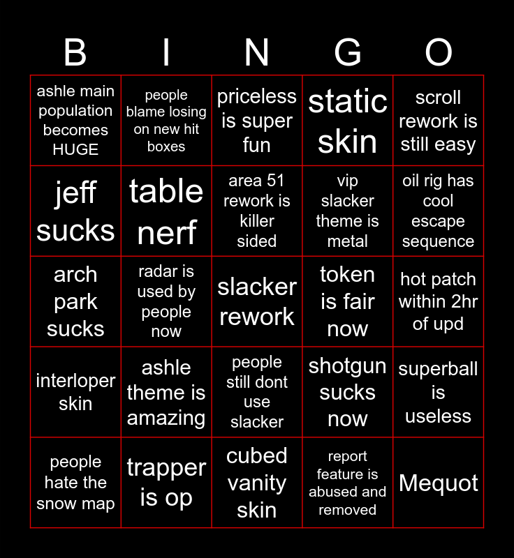 This bingo card has a free space and 24 words: ashle theme is amazing, trapper is op, area 51 rework is killer sided, people hate the snow map, scroll rework is still easy, ashle main population becomes HUGE, jeff sucks, people blame losing on new hit boxes, token is fair now, people still dont use slacker, vip slacker theme is metal, arch park sucks, shotgun sucks now, superball is useless, table nerf, report feature is abused and removed, hot patch within 2hr of upd, priceless is super fun, oil rig has cool escape sequence, radar is used by people now, Mequot, interloper skin, static skin and cubed vanity skin.