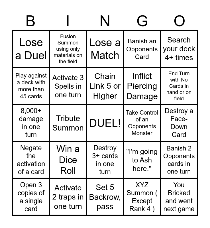 This bingo card has a free space and 41 words: Summon 5+ monsters in one turn, 8,000+ damage in one turn, Win without taking damage, Activate 3 Spells in one turn, Activate 2 traps in one turn, Destroy 3+ cards in one turn, Chain Link 5 or Higher, Use a Card of each type in one turn, Search your deck 4+ times, Negate the activation of a card, Tribute Summon, Banish an Opponents Card, You Bricked and went next game, Destroy a Face-Down Card, Take Control of an Opponents Monster, Win a Dice Roll, Win with less than 500 LP, Lose a Duel, Win a Match, Lose a Match, Banish 2 Opponents cards in one turn, Set a Monster, Set 5 Backrow, pass, Inflict Piercing Damage, Conduct a Pendulum Summon, Link Summon a Link-4 or higher monster, XYZ Summon ( Except Rank 4 ), Use a Quickplay Spell on the Opponents Turn, End Turn with No Cards in hand or on field, Synchro Summon Level 9 or Higher, Ritual Summon Level 9 or Higher, Fusion Summon using only materials on the field, Open 3 copies of a single card, Your card gets Called By The Grave'd, "I'm going to Ash here.", Play against a deck with more than 45 cards, Use a deck with more than 45 cards, End the Duel with 20+ cards in your GY, Special Summon twice from the GY, Your combo ends with a Rock Token and Your opponent completed a Bingo square.
