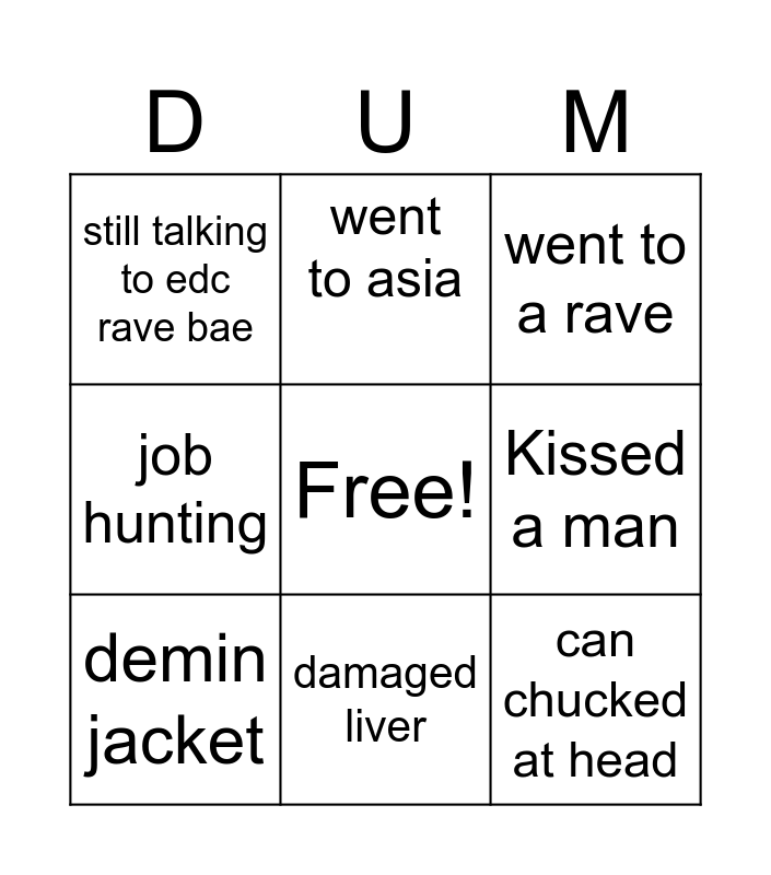 This bingo card has a free space and 8 words: Kissed a man, went to a rave, went to asia, demin jacket, still talking to edc rave bae, can chucked at head, job hunting and damaged liver.