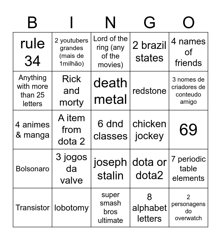 This bingo card has a free space and 24 words: 3 jogos da valve, lobotomy, death metal, Transistor, 4 names of friends, rule 34, Anything with more than 25 letters, 2 youtubers grandes (mais de 1milhão), chicken jockey, joseph stalin, redstone, 4 animes & manga, dota or dota2, 7 periodic table elements, Rick and morty, 8 alphabet letters, 69, Lord of the ring (any of the movies), 3 nomes de criadores de conteudo amigo, A item from dota 2, 2 personagens do overwatch, Bolsonaro, 2 brazil states and super smash bros ultimate.