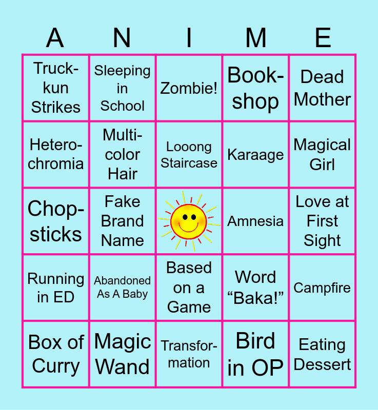 This bingo card has a free space and 153 words: Noodle Dish, Daruma Doll, Word “Baka!”, “-chan” Suffix, Dance Routine, Student Council, Look to the Horizon, Nationals Compe- tition!, Cat Person, Yaeba (Fang Tooth), Secret Identity, Family with Secrets, Karaage, Protag is OP, Love at First Sight, Dead Mother, Transfer Student, School Shut Down, Club Shut Down, Club Needs Members, Extreme MC Hair, Protag Classroom Seat, Akira Bike Skid, Where Are The Parents?, English Loan Word, Running in OP, Bird in OP, Running in ED, Bird in ED, Sleeping in ED, Tsundere, School Club, Nose Bleed, Adorable Sidekick Character, Running Late, Super Powers, Giant Robot, It's A Harem, Glomp!, Word “Ojīsan”, Childhood Friend, Isekai, Amnesia, Anthro-pomorphic Animals, Dropped Books, Looong Title, Two Riders, One Bike, Public Bathhouse, Secret Inheritance, “Onii-chan/san”, “Onee-chan/san”, Magical Girl, Kappa, Running With Toast, MF Jojo Reference, Pompadour Hair, Generic Male Protag, Generic Female Protag, Crashes Into Love Interest, Demon King / Queen, Sleeping in School, Surprise Animal Tail, Weird Hobby, Bowl Ramen, Cup Ramen, Thigh High Stockings, Abandoned As A Baby, Word “Obasan”, Mysterious Message, Inanimate Object Comes To Life, Special Hair Clip, Talisman / Amulet, Magic Wand, Magic Necklace, Lavender / Purple Hair, Green Hair, Blue Hair, White Hair, Sakura Tree, Sakura Petals, Curry Meal / Mention, Eating Dessert, Surprise! Death, Fake Brand Name, Multi-color Hair, Cat in OP, Cat in ED, Only One Eye, Box of Curry, Truck-kun Strikes, Word “Neko”, Transfor-mation, English in OP, Yokai, Special Jewelry, “Nani??”, Spirit Leaves Body, Internal Monologue, Twins, Magic / Special Creature, Elite School, Hetero- chromia, Resur-rected, Disaster Opening, Bento, Onigiri, Special Scar, Orphan, Cat in a Box, Dance in OP, Demon!, Vampire!, Zombie!, Giant Twin Tails, Word “Foreigner”, Secret Mission / Goal, Flashback, Local River, Based on a Game, Water Sprinkle, Cicada, Three-Wheel Truck, “Yankee” Character, Looong Staircase, Zap!, Eye Flash!, Piles of Trash, Chop-sticks, Sleep / Nose Bubble, Eyeglass Flash!, Book-shop, Ramen Shop, Alley Casual Bar, Street Food Stall, Izakaya, Shrine, Miko, Word “Shonen”, Campfire, Beach Scene, Gyaru, Need a Transfusion Bro?, BFG (Big F****** Gun), BFS (Big F****** Sword), Food on a Stick, Scooter!, You May Need A Size Up, Onoma-topoeia, Word “Gyoza”, Dump-lings!, Mystery Beverage, Extreme Curled Hair and Magic Status Screen.