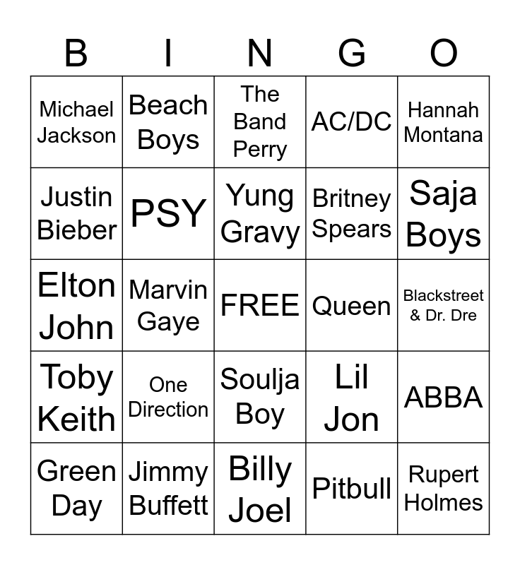 This bingo card has a free space and 24 words: One Direction, Jimmy Buffett, Yung Gravy, Green Day, Hannah Montana, Michael Jackson, Justin Bieber, Beach Boys, Queen, Soulja Boy, Britney Spears, Elton John, Lil Jon, ABBA, PSY, Pitbull, Blackstreet & Dr. Dre, The Band Perry, Saja Boys, Marvin Gaye, Rupert Holmes, Toby Keith, AC/DC and Billy Joel.