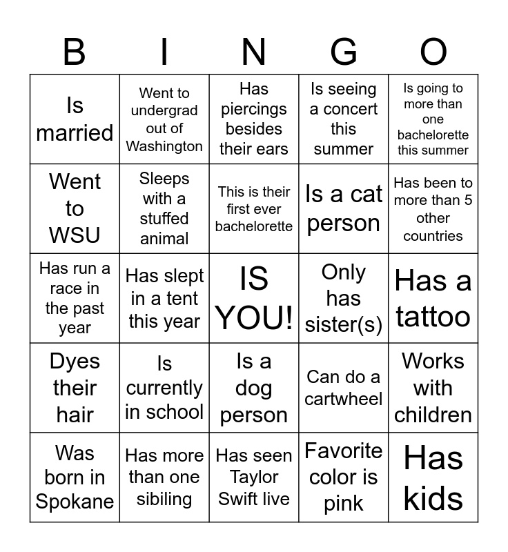 This bingo card has a free space and 24 words: Is currently in school, Has more than one sibiling, This is their first ever bachelorette, Was born in Spokane, Is going to more than one bachelorette this summer, Is married, Went to WSU, Went to undergrad out of Washington, Only has sister(s), Is a dog person, Is a cat person, Has run a race in the past year, Can do a cartwheel, Works with children, Sleeps with a stuffed animal, Favorite color is pink, Has a tattoo, Has piercings besides their ears, Has been to more than 5 other countries, Has slept in a tent this year, Has kids, Dyes their hair, Is seeing a concert this summer and Has seen Taylor Swift live.