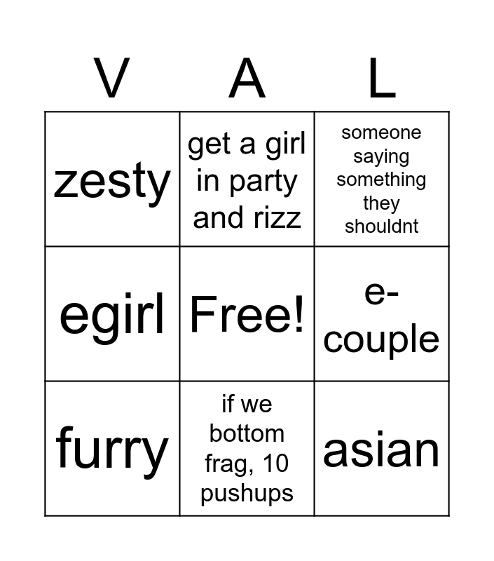 This bingo card has a free space and 8 words: e-couple, someone saying something they shouldnt, get a girl in party and rizz, furry, zesty, asian, egirl and if we bottom frag, 10 pushups.