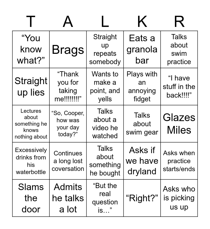 This bingo card has 25 words: Continues a long lost coversation, “But the real question is…”, Wants to make a point, and yells, Slams the door, Talks about swim practice, “You know what?”, Straight up lies, Brags, Talks about swim gear, Talks about something he bought, Plays with an annoying fidget, Lectures about something he knows nothing about, Asks if we have dryland, Asks when practice starts/ends, “Thank you for taking me!!!!!!!!”, Asks who is picking us up, Glazes Miles, Straight up repeats somebody, “I have stuff in the back!!!!”, “So, Cooper, how was your day today?”, Talks about a video he watched, Admits he talks a lot, Excessively drinks from his waterbottle, Eats a granola bar and “Right?”.