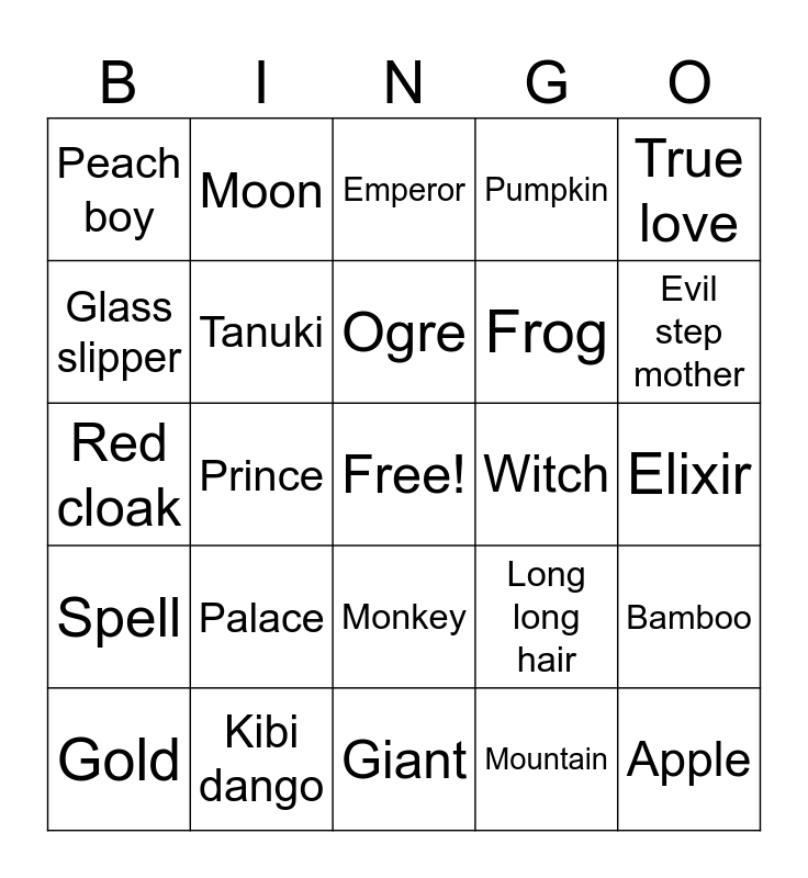 This bingo card has a free space and 24 words: Palace, Kibi dango, Ogre, Gold, True love, Peach boy, Glass slipper, Moon, Witch, Monkey, Frog, Red cloak, Long long hair, Bamboo, Tanuki, Mountain, Elixir, Emperor, Evil step mother, Prince, Apple, Spell, Pumpkin and Giant.