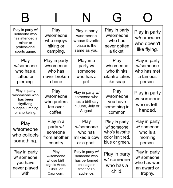 This bingo card has a free space and 24 words: Play in party w/ someone you have never played with, Play in a party w/ someone from another country, Play in a party w/ someone who has a pet., Play in party w/ someone who has a child., Play in party w/someone who doesn't like flying., Play in party w/ someone who has attended a minor or professional sports game., Play w/someone who enjoys hiking or camping., Play in party w/someone whose favorite pizza is the same as you., Play w/someone you have something in common, Play in party w/ someone who is left-handed., Play in party w/someone who has been skydiving, bungee jumping or snorkeling., Play in party w/someone who has never broken a bone., Play in party w/ someone who's favorite color isn't red, blue or green., Play in party w/ someone who is a morning person., Play w/someone who has a tattoo or piercing., Play w/someone whose birth sign is Aries, Libra, or Capricorn., Play in party w/ someone who has performed on stage in front of an audience., Play in party w/someone who has never gotten a ticket., Play in party w/someone who has met a famous person., Play w/someone who collects something., Play w/someone who prefers tea over coffee., Play w/someone who has milked a cow or a goat., Play w/someone who thinks cilantro takes like soap. and Play in party w/ someone who has won an award or trophy..