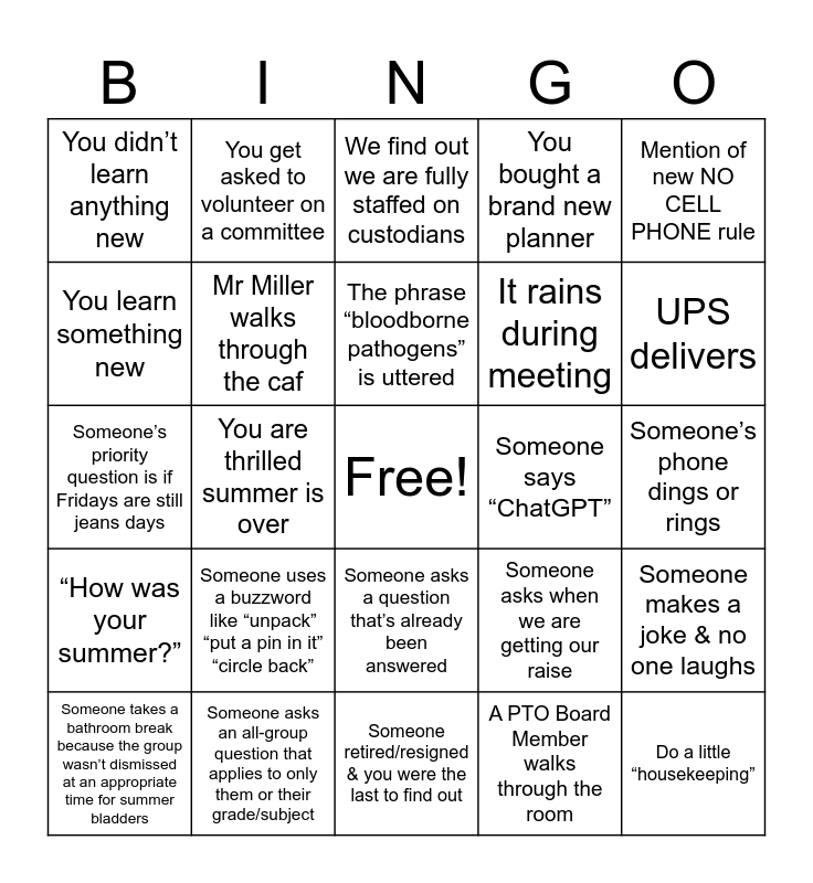 This bingo card has a free space and 24 words: Someone uses a buzzword like “unpack” “put a pin in it” “circle back”, Someone asks an all-group question that applies to only them or their grade/subject, The phrase “bloodborne pathogens” is uttered, Someone takes a bathroom break because the group wasn’t dismissed at an appropriate time for summer bladders, Mention of new NO CELL PHONE rule, You didn’t learn anything new, You learn something new, You get asked to volunteer on a committee, Someone says “ChatGPT”, Someone asks a question that’s already been answered, It rains during meeting, Someone’s priority question is if Fridays are still jeans days, Someone asks when we are getting our raise, Someone makes a joke & no one laughs, Mr Miller walks through the caf, A PTO Board Member walks through the room, Someone’s phone dings or rings, We find out we are fully staffed on custodians, UPS delivers, You are thrilled summer is over, Do a little “housekeeping”, “How was your summer?”, You bought a brand new planner and Someone retired/resigned & you were the last to find out.