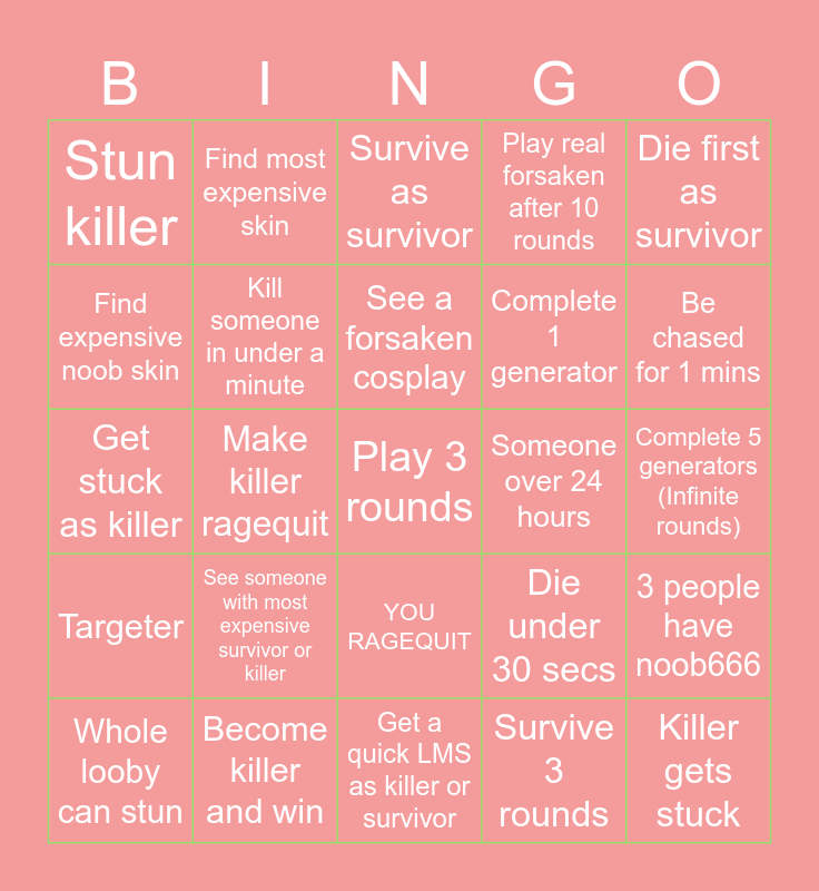This bingo card has a free space and 29 words: LMS noob666vs Guest666, Become killer and win, Survive as survivor, Die from players, Die first as survivor, Stun killer, Kill someone in under a minute, See a forsaken cosplay, Someone over 24 hours, 3 people have noob666, Whole looby can stun, Make killer ragequit, Survive 3 rounds, Killer gets stuck, Get stuck as killer, Get stuck as survivor, Get a quick LMS as killer or survivor, Die under 30 secs, Be chased for 1 mins, Targeter, See someone with most expensive survivor or killer, Play 10 rounds, Complete 1 generator, Complete 5 generators (Infinite rounds), Find expensive noob skin, Find most expensive skin, YOU RAGEQUIT, Play real forsaken after 10 rounds and Make guest 666's sprint never go below 100.