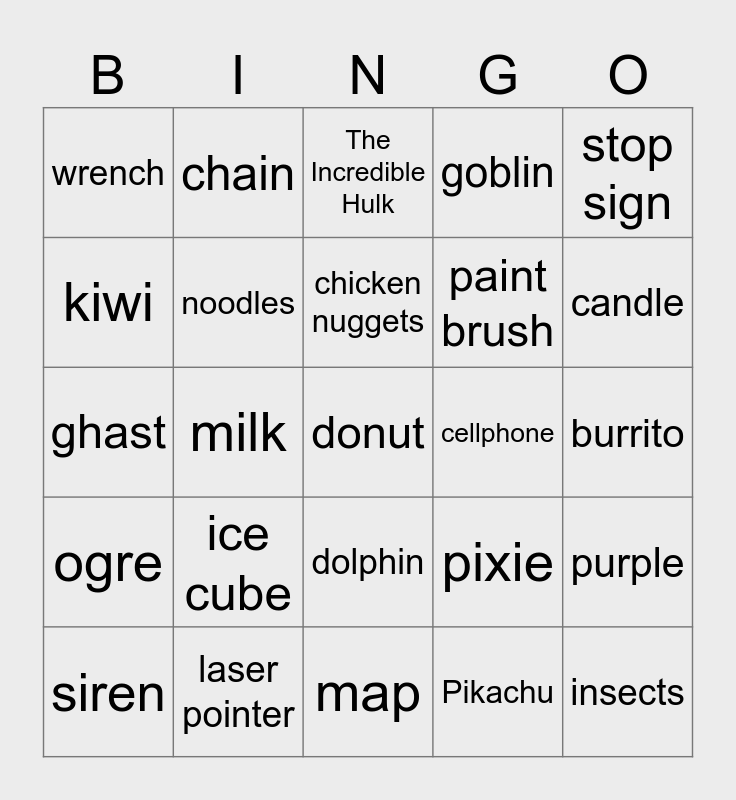 This bingo card has 25 words: ice cube, map, chicken nuggets, siren, stop sign, wrench, kiwi, chain, cellphone, dolphin, paint brush, ghast, pixie, purple, noodles, insects, burrito, The Incredible Hulk, candle, milk, donut, laser pointer, ogre, goblin and Pikachu.