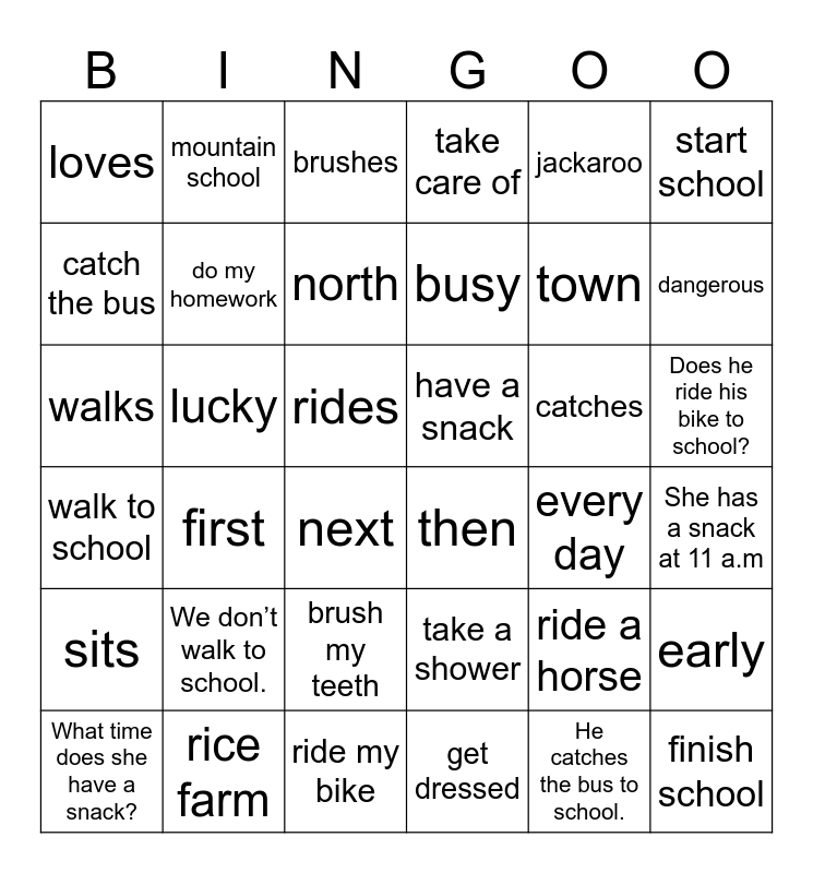 This bingo card has 36 words: take a shower, brush my teeth, get dressed, catch the bus, walk to school, have a snack, do my homework, ride my bike, jackaroo, ride a horse, dangerous, take care of, early, lucky, busy, loves, sits, catches, walks, brushes, rides, first, then, next, every day, mountain school, town, rice farm, north, start school, finish school, What time does she have a snack?, She has a snack at 11 a.m, Does he ride his bike to school?, We don’t walk to school. and He catches the bus to school..