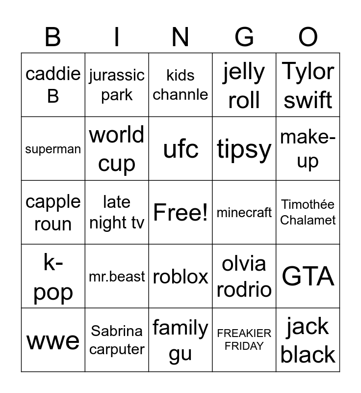 This bingo card has a free space and 24 words: mr.beast, Sabrina carputer, ufc, wwe, Tylor swift, caddie B, superman, jurassic park, minecraft, roblox, tipsy, capple roun, olvia rodrio, GTA, world cup, FREAKIER FRIDAY, Timothée Chalamet, kids channle, make-up, late night tv, jack black, k-pop, jelly roll and family gu.