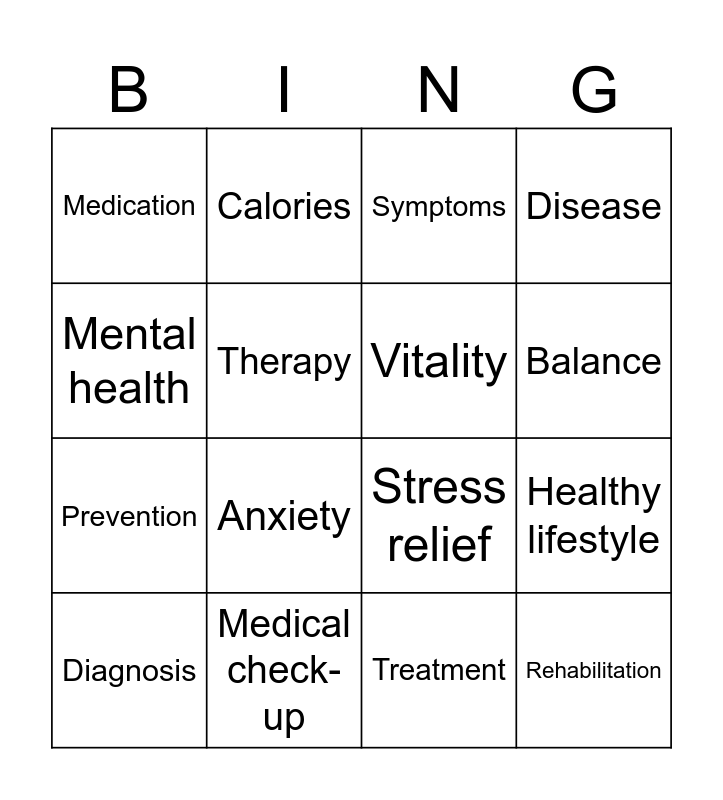 This bingo card has 38 words: Nutrition, Exercise, Fitness, Vitality, Immunity, Hydration, Balance, Free!, Mental health, Prevention, Healthy lifestyle, Disease, Diagnosis, Treatment, Therapy, Rehabilitation, Vaccination, Symptoms, Healthcare, Medical check-up, Medication, Stress, Anxiety, Depression, Relaxation, Alternative medicine, Yoga, Meditation, Healthy habits, Self-care, Physical activity, Diet, Superfoods, Calories, Vitamins, Minerals, Stress relief and Mental resilience.