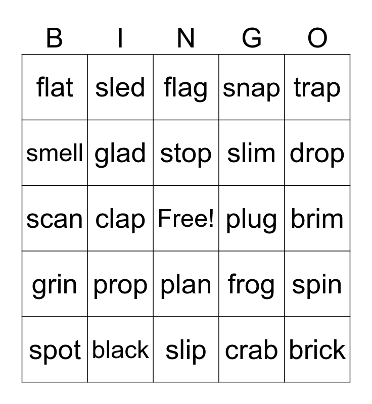 This bingo card has a free space and 30 words: black, block, clap, clip, flat, flag, glad, plan, plug, slip, brim, brick, crab, crop, drop, drum, frog, grin, prop, trap, scan, skip, sled, slim, smell, snap, spin, spot, stop and swim.