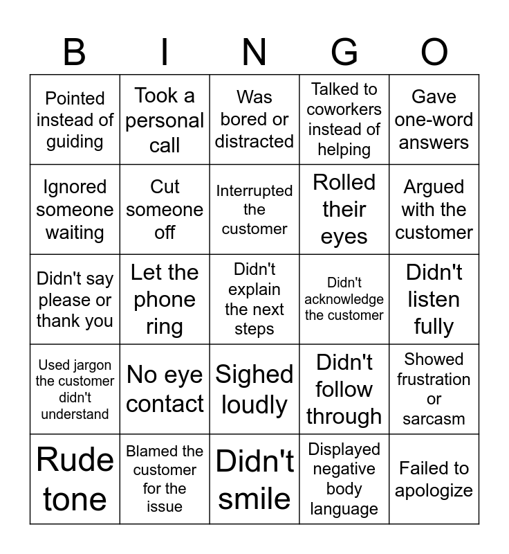 This bingo card has 25 words: No eye contact, Didn't smile, Interrupted the customer, Rude tone, Gave one-word answers, Pointed instead of guiding, Ignored someone waiting, Took a personal call, Didn't acknowledge the customer, Sighed loudly, Rolled their eyes, Didn't say please or thank you, Didn't follow through, Showed frustration or sarcasm, Cut someone off, Failed to apologize, Didn't listen fully, Was bored or distracted, Argued with the customer, Let the phone ring, Didn't explain the next steps, Blamed the customer for the issue, Used jargon the customer didn't understand, Talked to coworkers instead of helping and Displayed negative body language.