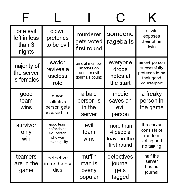 This bingo card has a free space and 24 words: teamers are in the game, good team defends an evil person who was proven guilty, an evil member snitches on another evil (journals count), detectives journal gets tagged, a twin exposes their other twin, one evil left in less than 3 nights, clown pretends to be evil, murderer gets voted first round, medic saves an evil person, a freaky person in the game, good team wins, savior revives a useless role, more than 4 people leave in the first round, the server consists of random voting and no talking, majority of the server is females, detective immediately dies, muffin man is overly popular, someone ragebaits, an evil person successfully pretends to be their good counterpart, survivor only win, a non talkative person gets accused first, evil team wins, everyone drops notes at the start and half the server has no journal.