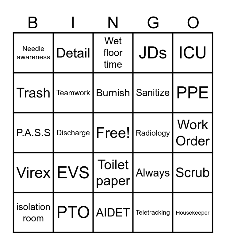 This bingo card has a free space and 29 words: isolation room, ER, Discharge, Linen, Needle awareness, Wet floor time, Teamwork, EVS, Radiology, PTO, Work Order, Housekeeper, AIDET, Teletracking, PPE, Mop heads, Toilet paper, Virex, ICU, P.A.S.S, Always, Tint Card, Sanitize, Trash, JDs, Detail, Scrub, Burnish and Carpets.