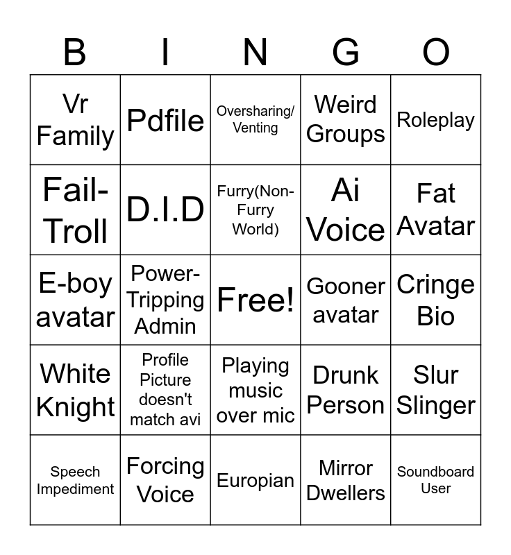 This bingo card has a free space and 24 words: Profile Picture doesn't match avi, Forcing Voice, Furry(Non-Furry World), Speech Impediment, Roleplay, Vr Family, Fail-Troll, Pdfile, Gooner avatar, Playing music over mic, Ai Voice, E-boy avatar, Drunk Person, Slur Slinger, D.I.D, Mirror Dwellers, Cringe Bio, Oversharing/ Venting, Fat Avatar, Power-Tripping Admin, Soundboard User, White Knight, Weird Groups and Europian.