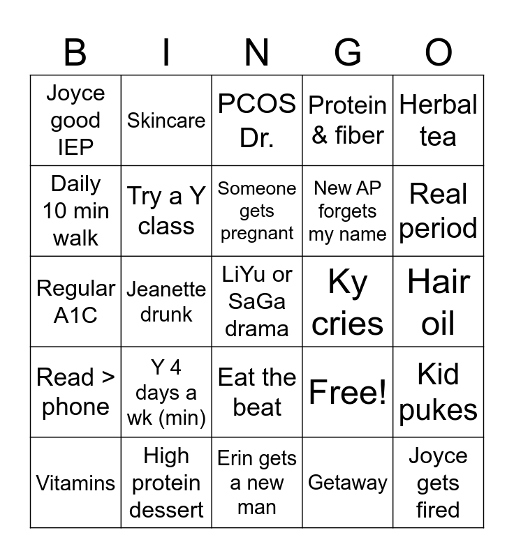This bingo card has 25 words: Y 4 days a wk (min), Erin gets a new man, Someone gets pregnant, Vitamins, Herbal tea, Joyce good IEP, Daily 10 min walk, Skincare, Ky cries, Eat the beat, New AP forgets my name, Regular A1C, Free!, Kid pukes, Try a Y class, Joyce gets fired, Hair oil, PCOS Dr., Real period, Jeanette drunk, LiYu or SaGa drama, High protein dessert, Read > phone, Protein & fiber and Getaway.