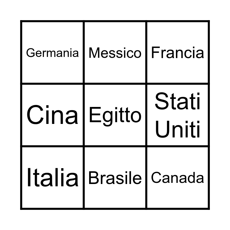 This bingo card has 18 words: Italia, Spagna, Francia, Germania, Brasile, Stati Uniti, Inghilterra, Messico, Argentina, Cina, Giappone, Canada, Russia, Egitto, Grecia, India, Corea and Australia.