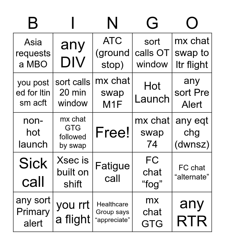 This bingo card has a free space and 48 words: Robert posts a GIF, any RTR, any ATB, Healthcare Group says “appreciate”, Xsec is built on shift, you build an xsec, any DIV, Hub Held delay in SDF, you post ed for ltin sm acft, sort calls 15 min window, sort calls 20 min window, sort calls OT window, FC chat “alternate”, FC chat “fog”, mx chat swap 76P, mx chat swap 75P, mx chat swap M1F, mx chat swap 74, mx chat swap A30, mx chat swap to ltr flight, mx chat GTG followed by swap, mx chat GTG, Asia requests a MBO, Hot Launch, Daily Ops “waves” or “taking over”, any sort Pre Alert, any sort Primary alert, any sort Ops Ban, Fatigue call, Sick call, JA for a crew, any RTO, USPS chat “let me check”, you cancel a flt (other than hot), you rrt a flight, you build a new flight, you do an eqt chg, any eqt chg (dwnsz), any eqt chg (upsize), non Cont says “red river”, airborne holding, ATC (holding or GDP), ATC (ground stop), BGR on fog list, non-hot launch, any chat “curfew”, FSD capacity and FC mentions “low ceilings”.