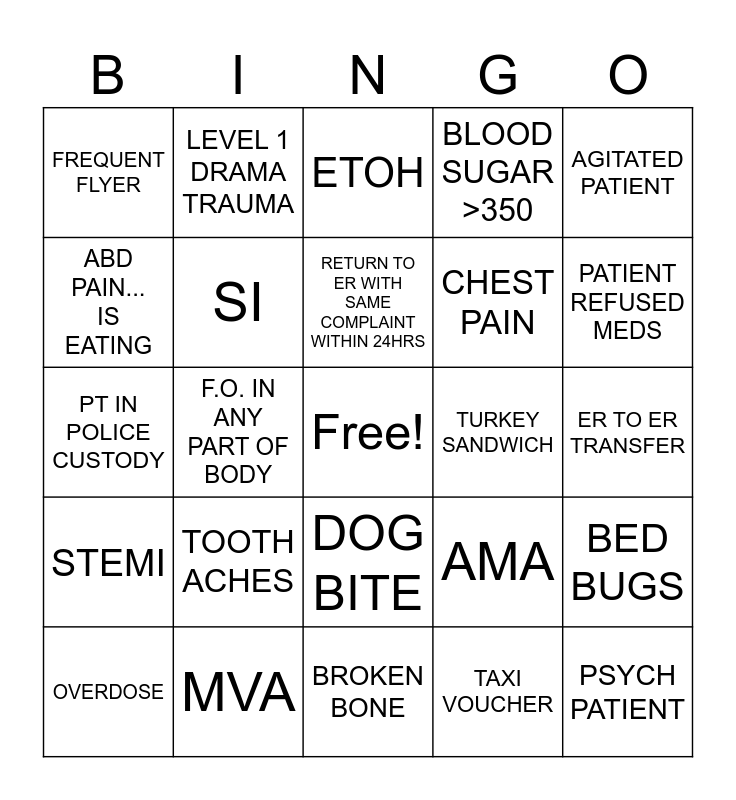 This bingo card has a free space and 24 words: TOOTH ACHES, MVA, RETURN TO ER WITH SAME COMPLAINT WITHIN 24HRS, OVERDOSE, AGITATED PATIENT, FREQUENT FLYER, ABD PAIN... IS EATING, LEVEL 1 DRAMA TRAUMA, TURKEY SANDWICH, DOG BITE, CHEST PAIN, PT IN POLICE CUSTODY, AMA, BED BUGS, SI, TAXI VOUCHER, ER TO ER TRANSFER, ETOH, PATIENT REFUSED MEDS, F.O. IN ANY PART OF BODY, PSYCH PATIENT, STEMI, BLOOD SUGAR >350 and BROKEN BONE.