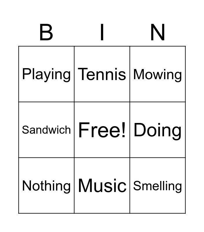 This bingo card has a free space and 19 words: Cutting, Grass, Mowing, Hiking, Listening, Smelling, Flowers, Playing, Tennis, Feeding, Ducks, Doing, Nothing, Stuck, Kite, Eating, Sandwich, Music and Salad.