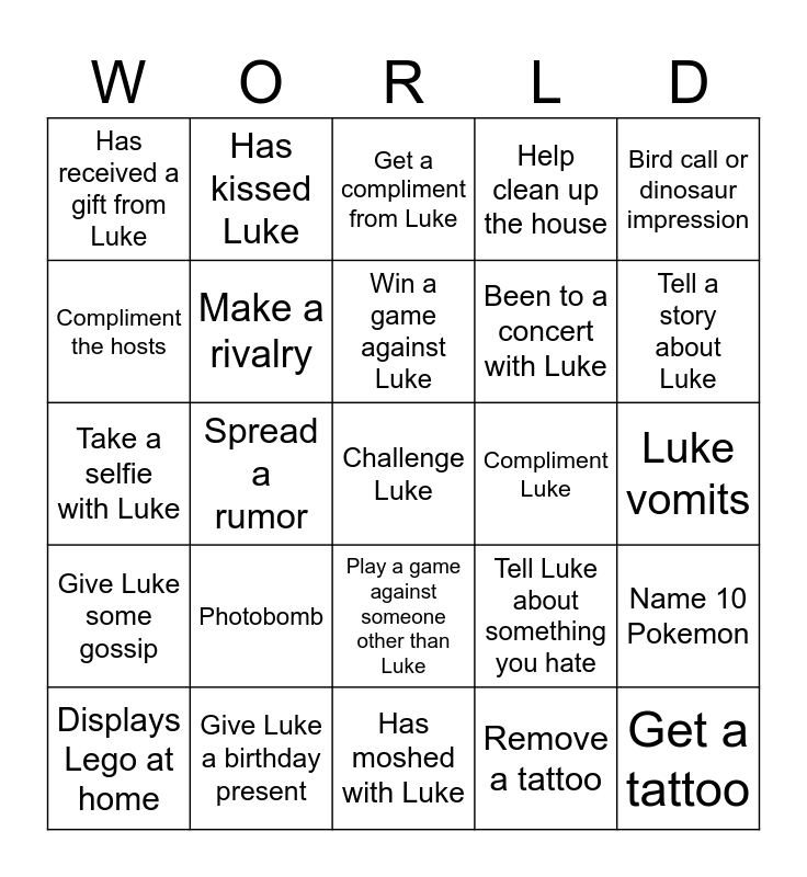 This bingo card has a free space and 24 words: Photobomb, Give Luke a birthday present, Win a game against Luke, Displays Lego at home, Bird call or dinosaur impression, Has received a gift from Luke, Compliment the hosts, Has kissed Luke, Compliment Luke, Play a game against someone other than Luke, Been to a concert with Luke, Take a selfie with Luke, Tell Luke about something you hate, Name 10 Pokemon, Make a rivalry, Remove a tattoo, Luke vomits, Get a compliment from Luke, Tell a story about Luke, Spread a rumor, Get a tattoo, Give Luke some gossip, Help clean up the house and Has moshed with Luke.