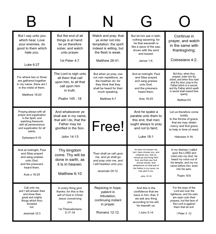 This bingo card has a free space and 41 words: But let him ask in faith, nothing wavering; for he that wavereth is like a wave of the sea, driven with the wind and tossed. James 1:6., Thy kingdom come. Thy will be done in earth, as it is in heaven. Matthew 6:10, After this manner therefore pray ye: Our Father which art in heaven, Hallowed be thy name. Matthew 6:9, And he spake a parable unto them to this end, that men ought always to pray and not to faint; Luke 18:1, For the eyes of the Lord are over the righteous, and his ears are open unto their prayers: but the face of the Lord is against them that do evil. I Peter 3 :12, And at midnight, Paul and Silas prayed and sang praises unto God, and the prisoners heard them. Acts s 16:25, And whatsoever ye shall ask in my name, that will I do, that the Father may be glorified in the Son. John 14:13, And if we know that he hear us, whatsoever we ask, we know that we have the petitions that we desired of him. 1st John 5:15., And at midnight, Paul and Silas prayed and sang praises unto God, and the prisoners heard them. Acts 16:25, In my distress I called upon the LORD and cried unto my God: he heard my voice out of his temple, and my cry came before him, even into his ears. Psalm 18:6, For where two or three are gathered together in my name, there am I in the midst of them. Matthew 18:20, But the end of all things is at hand: be ye therefore sober, and watch unto prayer. 1st Peter 4:7., Ye have not chosen me, but I have chosen you, and ordained you, that ye should go and bring forth fruit, and that your fruit should remain: that whatsoever ye shall ask of the Father in my name, he may give it you. John 15:16, Let us therefore come boldly to the throne of grace, that we may obtain mercy and find grace to help in time of need. Hebrews 4:16., Praying always with all prayer and supplication in the Spirit, and watching thereunto with all perseverance and supplication for all saints; Ephesians 6:18., In every thing give thanks: for this is the will of God in Christ Jesus concerning you. 1st Thessalonians 5:17-18, Then shall ye call upon me, and ye shall go and pray unto me, and I will hearken unto you. Jeremiah 29:12., But let him ask in faith, nothing wavering; for he that wavereth is like a wave of the sea, driven with the wind and tossed. James 1:6., For where two or three are gathered together in my name, there am I in the midst of them. Matthew 18:20, But I say unto you which hear, Love your enemies, do good to them which hate you, Luke 6:27, Pray without ceasing. 1st Thessalonians 5:17, Rejoicing in hope, patient in tribulation, continuing instant in prayer. Romans 12:12., The Lord is nigh unto all them that call upon him, to all that call upon him in truth. Psalm 145:18, Continue in prayer, and watch in the same with thanksgiving; Colossians 4:2., If ye abide in me, and my words abide in you, ye shall ask what ye will, and it shall be done unto you. John 15:7., And I say unto you, Ask, and it shall be given you; seek, and ye shall find; knock, and it shall be opened unto you. Luke 11: 9, But when ye pray, use not vain repetitions, as the heathen do: for they think that they shall be heard for their much speaking. Matthew 6:7, Likewise the Spirit also helpeth our infirmities: for we know not what we should pray for as we ought: but the Spirit itself maketh intercession for us with groanings which cannot be uttered. Romans 8:26., But thou, when thou prayest, enter into thy closet, and when thou hast shut thy door, pray to thy Father which is in secret; and thy Father which seeth in secret shall reward thee openly. Matthew 6:6, Continue in prayer, and watch in the same with thanksgiving; Colossians 4:2., I exhort therefore, that, first of all, supplications, prayers, intercessions, and giving of thanks, be made for all men; I Timothy 2 : 1, Watch and pray, that ye enter not into temptation: the spirit indeed is willing, but the flesh is weak. Matthew 26:41., And this is the confidence that we have in him, that, if we ask any thing according to his will, he heareth us: I John 5:14, Bless them that curse you, and pray for them which despitefully use you. Luke 6:28., Call unto me, and I will answer thee and show thee great and mighty things which thou knowest not. Jeremiah 33:3, The Lord is nigh unto all them that call upon him, to all that call upon him in truth. Psalm 145 : 18, Then shall ye call upon me, and ye shall go and pray unto me, and I will hearken unto you. Jeremiah 29:12., Therefore I say unto you, What things soever ye desire, when ye pray, believe that ye receive them, and ye shall have them. Mark 11:24., Confess your faults one to another, and pray one for another, that ye may be healed. The effectual fervent prayer of a righteous man availeth much. James 5:16., Watch and pray, that ye enter not into temptation: the spirit indeed is willing, but the flesh is weak. Matthew 26:41. and Likewise the Spirit also helpeth our infirmities: for we know not what we should pray for as we ought: but the Spirit itself maketh intercession for us with groanings which cannot be uttered. Romansr 8:26..