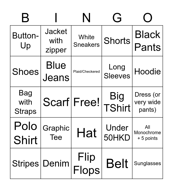 This bingo card has a free space and 24 words: Graphic Tee, Denim, Plaid/Checkered, Stripes, Black Pants, Button-Up, Shoes, Jacket with zipper, Big TShirt, Hat, Long Sleeves, Bag with Straps, Under 50HKD, All Monochrome + 5 points, Blue Jeans, Belt, Dress (or very wide pants), White Sneakers, Hoodie, Scarf, Sunglasses, Polo Shirt, Shorts and Flip Flops.