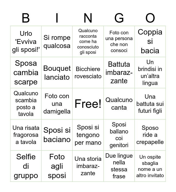 This bingo card has a free space and 24 words: Sposi si baciano, Foto agli sposi, Bicchiere rovesciato, Selfie di gruppo, Coppia si bacia, Urlo 'Evviva gli sposi!', Sposa cambia scarpe, Si rompe qualcosa, Qualcuno canta, Sposi si tengono per mano, Battuta imbaraz-zante, Qualcuno scambia posto a tavola, Sposi ballano coi genitori, Sposo ride a crepapelle, Bouquet lanciato, Due lingue nella stessa frase, Una battuta sui futuri figli, Qualcuno racconta come ha conosciuto gli sposi, Un brindisi in un’altra lingua, Foto con una damigella, Un ospite sbaglia nome a un altro invitato, Una risata fragorosa a tavola, Foto con una persona che non consoci and Una storia imbaraz-zante.