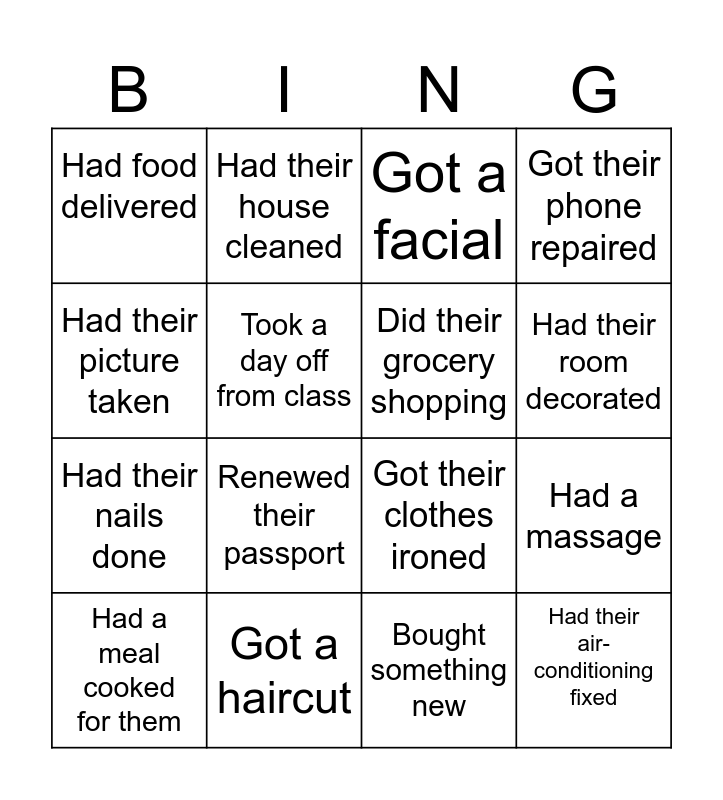 This bingo card has 16 words: Got a haircut, Had a massage, Got a facial, Had food delivered, Had their nails done, Had their house cleaned, Got their clothes ironed, Bought something new, Had their picture taken, Took a day off from class, Had a meal cooked for them, Got their phone repaired, Renewed their passport, Had their room decorated, Did their grocery shopping and Had their air-conditioning fixed.