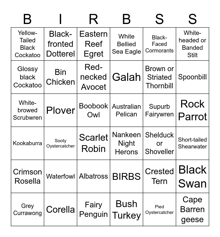 This bingo card has 36 words: BIRBS, Albatross, Bush Turkey, Glossy black Cockatoo, Kookaburra, Australian Pelican, Bin Chicken, Fairy Penguin, Black-Faced Cormorants, Crested Tern, Spoonbill, White Bellied Sea Eagle, Black Swan, Plover, Galah, Yellow-Tailed Black Cockatoo, Crimson Rosella, Supurb Fairywren, White-browed Scrubwren, Eastern Reef Egret, Boobook Owl, Sooty Oystercatcher, Nankeen Night Herons, Scarlet Robin, Shelduck or Shoveller, Black-fronted Dotterel, Brown or Striated Thornbill, Corella, Red-necked Avocet, White-headed or Banded Stilt, Cape Barren geese, Grey Currawong, Short-tailed Shearwater, Rock Parrot, Waterfowl and Pied Oystercatcher.