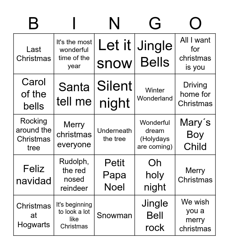 This bingo card has a free space and 24 words: Rudolph, the red nosed reindeer, It's beginning to look a lot like Christmas, Silent night, Christmas at Hogwarts, All I want for christmas is you, Last Christmas, Carol of the bells, It's the most wonderful time of the year, Wonderful dream (Holydays are coming), Petit Papa Noel, Winter Wonderland, Rocking around the Christmas tree, Oh holy night, Merry Christmas, Santa tell me, Jingle Bell rock, Mary´s Boy Child, Let it snow, Driving home for Christmas, Merry christmas everyone, We wish you a merry christmas, Feliz navidad, Jingle Bells and Snowman.
