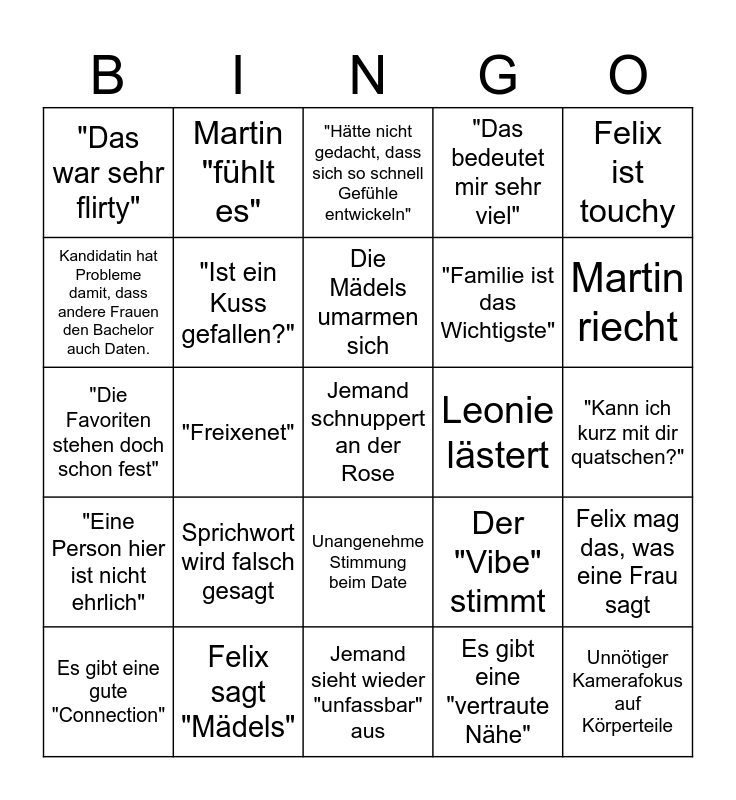This bingo card has 30 words: Felix sagt "Mädels", "Das war ein Traumdate", "Freixenet", Felix macht komische Geräusche nach dem Küssen, "Das war sehr flirty", "Hätte nicht gedacht, dass sich so schnell Gefühle entwickeln", "Ist ein Kuss gefallen?", Unangenehme Stimmung beim Date, Leonie lästert, Jemand sieht wieder "unfassbar" aus, "Kann ich kurz mit dir quatschen?", Jemand schnuppert an der Rose, Es gibt eine "vertraute Nähe", Unnötiger Kamerafokus auf Körperteile, Martin riecht, Kuss, Der "Vibe" stimmt, "Eine Person hier ist nicht ehrlich", Sprichwort wird falsch gesagt, Felix ist touchy, "Die Favoriten stehen doch schon fest", Jemand weint, Martin "fühlt es", "Familie ist das Wichtigste", Kandidatin hat Probleme damit, dass andere Frauen den Bachelor auch Daten., "Das bedeutet mir sehr viel", Felix mag das, was eine Frau sagt, Es gibt eine gute "Connection", Die Mädels umarmen sich and "Nicht wahr?!".