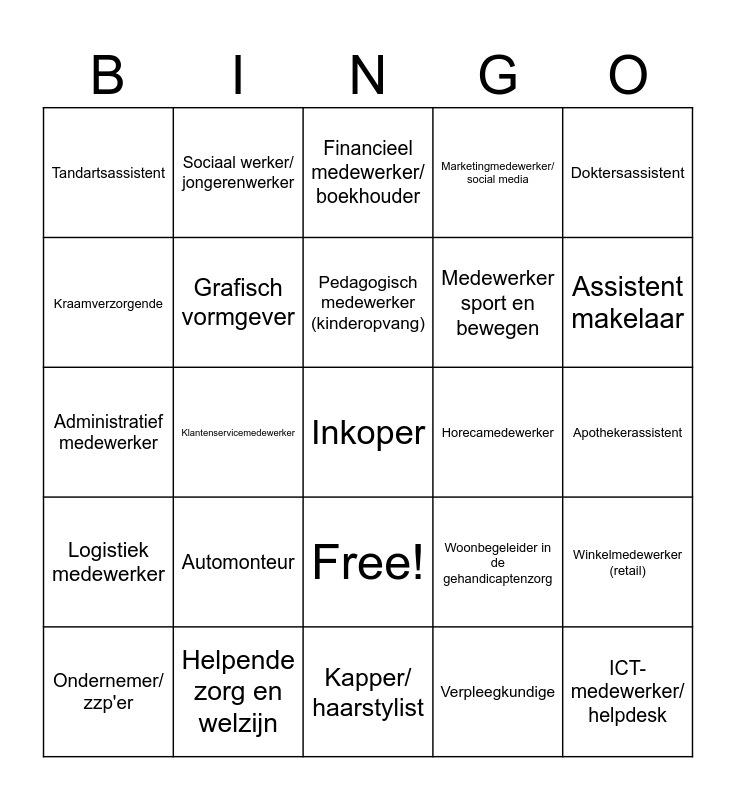 This bingo card has 26 words: Free!, Verpleegkundige, Pedagogisch medewerker (kinderopvang), Helpende zorg en welzijn, Doktersassistent, Tandartsassistent, Kraamverzorgende, Sociaal werker/ jongerenwerker, Apothekerassistent, Woonbegeleider in de gehandicaptenzorg, Medewerker sport en bewegen, Administratief medewerker, Winkelmedewerker (retail), Ondernemer/ zzp'er, Klantenservicemedewerker, Receptionist(e), Marketingmedewerker/ social media, Logistiek medewerker, Financieel medewerker/ boekhouder, Inkoper, Assistent makelaar, Kapper/ haarstylist, Horecamedewerker, Automonteur, Grafisch vormgever and ICT-medewerker/ helpdesk.