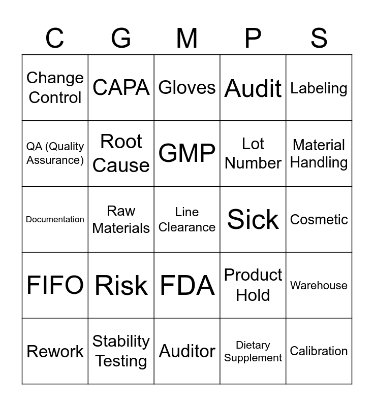 This bingo card has 75 words: Packaging, Hairnet, Gloves, Handwashing, Lab Coat, Sanitizer, No Jewelry, SOP (Standard Operating Procedure), Cross-contamination, Batch Record, Calibration, PPE, GMP, QA (Quality Assurance), Visual Inspection, Raw Materials, Finished Product, Line Clearance, Temperature Log, Labeling, Pest Control, Documentation, Root Cause, CAPA, Audit, Deviation Report, Cleaning Schedule, Training Record, Safety Glasses, Allergen Control, Sample Collection, Waste Disposal, Contamination, Product Hold, Material Handling, Lot Number, Inventory Control, Preventive Maintenance, Cosmetic, Dietary Supplement, Spill Kit, Nonconformance, Report Illness, Quality Control, Production Area, Quarantine, Rework, Change Control, Safety Data Sheet (SDS), Equipment Log, CFR, FDA, Recall, Testing, Training, Code of Federal Regulations, Food Safety, Label, Personal Hygiene, Product Safety, Risk, CIP(Clean in Place), Housekeeping, No White Out, Cross out, Sick, Compliance, Validate, Out of Spec, Warehouse, FIFO, Stability Testing, Records, Auditor and Production.