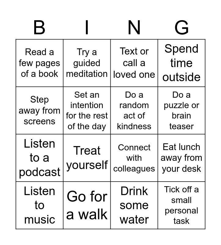This bingo card has 16 words: Go for a walk, Eat lunch away from your desk, Text or call a loved one, Read a few pages of a book, Listen to a podcast, Try a guided meditation, Connect with colleagues, Drink some water, Step away from screens, Set an intention for the rest of the day, Listen to music, Spend time outside, Treat yourself, Do a puzzle or brain teaser, Do a random act of kindness and Tick off a small personal task.