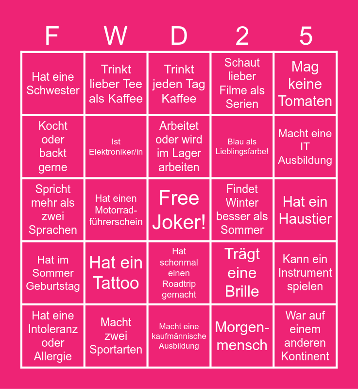 This bingo card has a free space and 24 words: Hat ein Tattoo, Macht zwei Sportarten, Arbeitet oder wird im Lager arbeiten, Hat eine Intoleranz oder Allergie, Mag keine Tomaten, Hat eine Schwester, Kocht oder backt gerne, Trinkt lieber Tee als Kaffee, Findet Winter besser als Sommer, Hat schonmal einen Roadtrip gemacht, Blau als Lieblingsfarbe!, Spricht mehr als zwei Sprachen, Trägt eine Brille, Kann ein Instrument spielen, Ist Elektroniker/in, Morgen- mensch, Hat ein Haustier, Trinkt jeden Tag Kaffee, Macht eine IT Ausbildung, Hat einen Motorrad-führerschein, War auf einem anderen Kontinent, Hat im Sommer Geburtstag, Schaut lieber Filme als Serien and Macht eine kaufmännische Ausbildung.