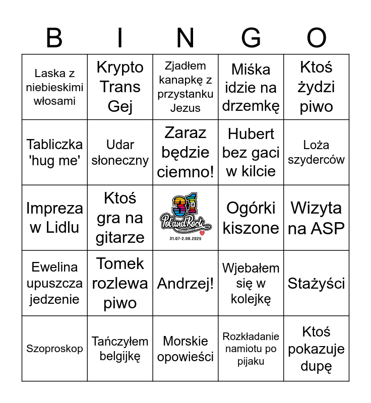 This bingo card has a free space and 64 words: Olbrom, Cycki, Czyjś rodzic w obozie, Stażyści, Kłótnia z ochroną w Lidlu, JIP, Krypto Trans Gej, Patrycja!, Zaraz będzie ciemno!, Darmowe jedzenie, Andrzej!, Najebany Owsiak na scenie, Wizyta na ASP, Ktoś żydzi piwo, ZGON, Tabliczka 'hug me', Ktoś gra na gitarze, Laska z niebieskimi włosami, Masz ognia?, Hubert bez gaci w kilcie, Tomek rozlewa piwo, Ewelina upuszcza jedzenie, Miśka idzie na drzemkę, Jezus gra na gitarze, Typ bez zębów zarywa do Justyny, Rozmowy o stomatologii, Michał gra na harmonijce, Łukasz przynosi alkohol, Ktoś wypierdala się o odciąg, Ruchanie się w namiocie, Ktoś szuka zioła, Przychodzi Pokojowy Patrol, Dagmara traci głos, Kamil częstuje Jeggerem, Loża szyderców, Szoproskop, Pada deszcz, Rozkładanie namiotu po pijaku, Jedzenie z brokatem, Udar słoneczny, Impreza w Lidlu, Ogórki kiszone, Prysznic w lodowatej wodzie, Grałem we flanki, Dowcip o żydach, Ktoś pokazuje dupę, Tańczyłem belgijkę, Byłem na kole allegro, Wjebałem się w kolejkę, MACIUŚ, Wiata padła, Ktoś je zupkę chińską, Morskie opowieści, Posprzątałem w obozie, "Czy tu się pokazuje cycki?", Golas przy kranach, Zjadłem kanapkę z przystanku Jezus, Ktoś pokazał dupę na scenie, Byłem na koncercie, Puszek, Przegrałem!, Muzyk / artysta w obozie, "Masz fajka?" and Bandamka z Play.