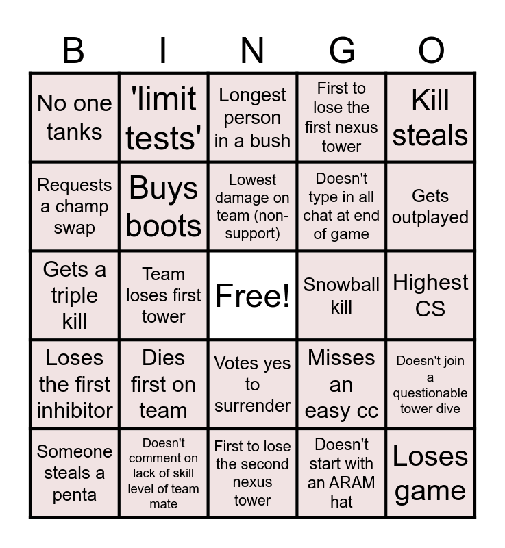This bingo card has a free space and 24 words: Dies first on team, Doesn't comment on lack of skill level of team mate, Lowest damage on team (non-support), Someone steals a penta, Kill steals, No one tanks, Requests a champ swap, 'limit tests', Snowball kill, Votes yes to surrender, Doesn't type in all chat at end of game, Gets a triple kill, Misses an easy cc, Doesn't join a questionable tower dive, Buys boots, Doesn't start with an ARAM hat, Highest CS, Longest person in a bush, Gets outplayed, Team loses first tower, Loses game, Loses the first inhibitor, First to lose the first nexus tower and First to lose the second nexus tower.