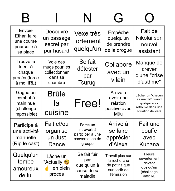 This bingo card has a free space and 24 words: Fait et/ou organise un Just Dance, Lâche un "Actually 🤓☝️" en plein procès, Se fait détester par Tsurugi, Quelqu'un tombe amoureux de lui, Fait de Nikolai son nouvel assistant, Envoie Ethan faire une course poursuite à sa place, Trouve le tueur à chaque procès (force à moi IRL), Découvre un passage secret par pur hasard, Arrive à avoir une relation positive avec Mûu, Force un introverti à participer à une conversation de groupe, Collabore avec un vilain, Gagne un combat à main nue (challenge impossible), Arrive à se faire apprécier d'Alexa, Fait une bouffe avec Kuhana, Vole des mugs pour les collectionner dans sa chambre, Travail plus sur la recherche de potins que sur sortir de l'émission, Lâcher un "chacun sa merde" quand quelqu'un se retrouve dans une situation délicate, Vexe très fortement quelqu'un, Manque de crever d'une "crise d'asthme", Brûle la cuisine, Pleure ouvertement devant quelqu'un (challenge difficile), Participe à une activité manuelle (Rip le cast), Empêche quelqu'un de prendre de la drogue and Se fait fuir par quelqu'un à cause de sa maladie.